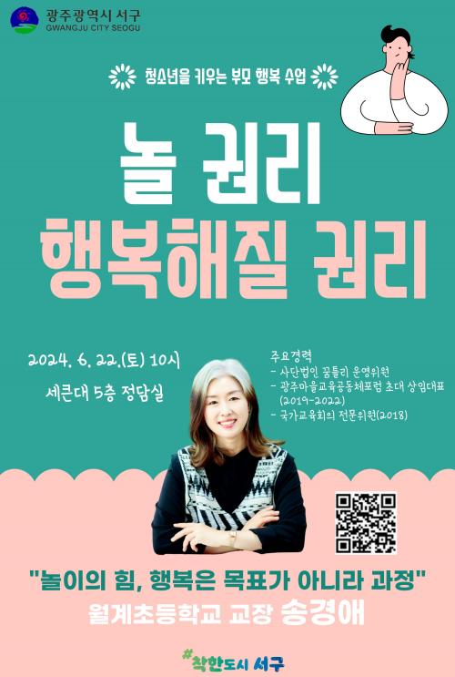 ¼­±¸´Â ¿À´Â 22ÀÏ ¼¼Å«´ë(¼­±¸ °æ¿­·Î 28) 5Ãþ Á¤´ã½Ç¿¡¼­ ¿ù°èÃʵîÇб³ ±³ÀåÀÌÀÚ (»ç)²ÞƲ¸® ¿î¿µÀ§¿øÀÎ ¼Û°æ¾Ö °­»ç¸¦ ÃÊÃ»ÇØ ¡®³î ±Ç¸®, Çàº¹ÇØÁú ±Ç¸®¡¯¸¦ ÁÖÁ¦·Î ±³À°À» ÁøÇàÇÑ´Ù. ¼Û °­»ç´Â À̳¯ ³îÀÌÀÇ Èû°ú ÇູÀº ¸ñÇ¥°¡ ¾Æ´Ï¶ó °úÁ¤À̶ó´Â °æÇè´ãÀ» Ç®¾î³¾ ¿¹Á¤ÀÌ´Ù.