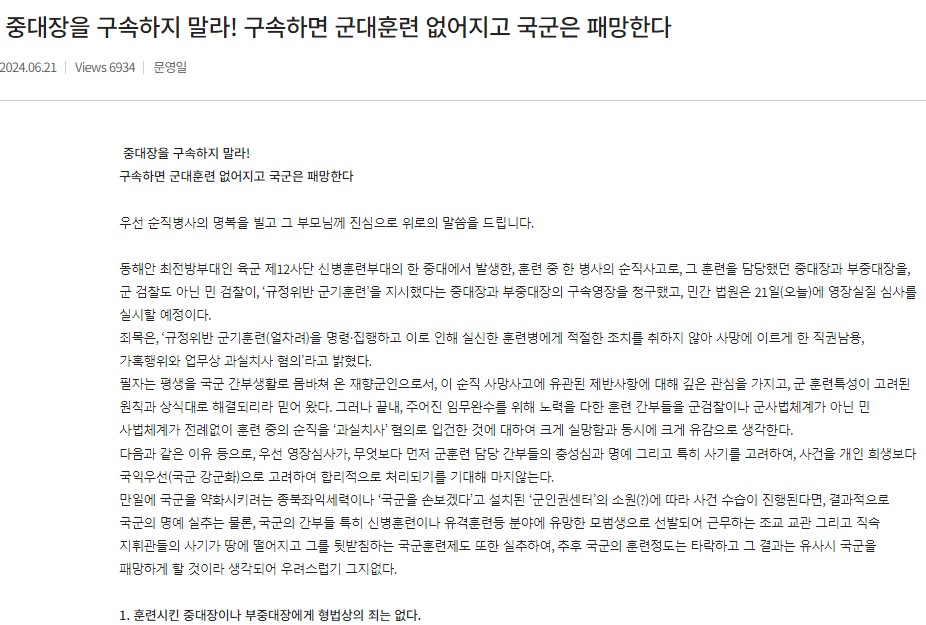 ¡°°³ÀÎÀûÀ¸·Î´Â ¿î¸íÀ̶ó »ý°¢ÇϽðí, ±× ºÎ´ë Àü¿ø°ú ±¹±º ÀüºÎ°¡ ±×¸®°í ±¹°¡°¡ À§·ÎÇØ µå¸²À» ¹ÞÀ¸¼Å¼ Çѵ¿¾ÈÀÇ ½Ç¸ÁÀ» ±Øº¹ÇϽðí, À§±¹Çå½ÅÇÏ¿© ±¹±º ÃæÈ¥ Àü´ç¿¡ ¼½Ç ¼øÁ÷¿ë»ç¸¦ º¸¾Æ Áֽñ⸦ Àüü ±¹¹ÎÀº ±âµµµå¸± °Í.(2024³â 6¿ù 21ÀÏ. ±¹°¡¾Èº¸Àü·«»ç»ó»çÇÐ ¿¬±¸È¸ ´ëÇ¥ ¹®¿µÀÏ(¿¹, À°±ºÁßÀå))¡±À̶ó°í Çß´Ù.
