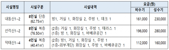 À̹ø ½ÅÃà ¼÷¹Ú½Ã¼³ 8°³µ¿Àº ³»µ¿»ê 1~2È£(8ÀνÇ, ´ÜÃþ), ¼±°¢»ê1~2È£(8ÀνÇ, º¹Ãþ), ´öÅ»ê1~4È£(4ÀνÇ, ¿ÜºÎº¹Ãþ)·Î ±¸¼ºµÇ¾î ÀÖÀ¸¸ç °¢ ½Ã¼³¿¡ ´ëÇÑ ³»¿ª°ú ¿ä±ÝÀº ´ÙÀ½°ú °°´Ù.