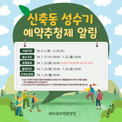 ÀÌ¿ëÀ» Èñ¸ÁÇÏ´Â »ç¶÷Àº ½£³ªµée ½Ã½ºÅÛÀ» ÅëÇØ ´©±¸³ª ½ÅûÇÒ ¼ö ÀÖ´Ù. ¿¹¾à½ÅûÀº 7¿ù 17ÀÏ 09½Ã ~ 22ÀÏ 18½Ã±îÁö ½Ç½ÃÇϸç, ½£³ªµée ´©¸®ÁýÀ» ÅëÇØ ¼÷¹Ú ±â°£ ÃÖ´ë 2¹Ú 3ÀϱîÁö °¡´ÉÇϰí, ½ÅûÀÚ´Â ÀÌ¿ëÀ» ¿øÇÏ´Â ³¯Â¥¿Í °´½ÇÀ» ÁöÁ¤ÇÏ¿© ½ÅûÀ» ÇÏ¸é µÈ´Ù.