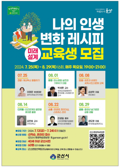 ±³À° ´ë»óÀº 40¼¼ ÀÌ»ó ±º»ê½Ã¹ÎÀÌ¸é ´©±¸³ª Âü¿© °¡´ÉÇϸç, ¼ö°­À» ¿øÇÏ´Â ½Ã¹ÎÀº 7¿ù 24ÀϱîÁö ±º»ê½ÃÆò»ýÇнÀÁ¤º¸¸Á¿¡ Á¢¼ÓÇÏ¿© ½ÅûÇÏ¸é µÈ´Ù.