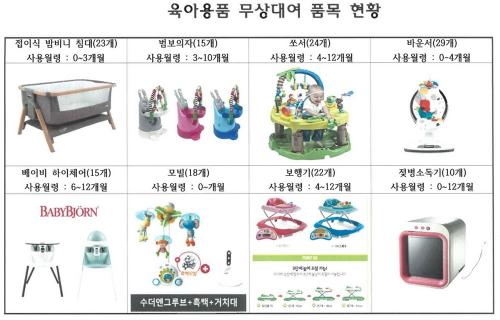 ¶ÇÇÑ, ±èÁ¦½Ã °ÅÁÖ Ãâ»ê°¡Á¤ÀÇ ¿µ¾Æ(0~12°³¿ù)´Â À°¾Æ¿ëǰ ¹× À¯Ãà±â¸¦ ¹«»óÀ¸·Î ´ë¿©ÇÒ ¼ö ÀÖ´Ù. À°¾Æ¿ëǰÀº 1ÀÎ 1ǰ¸ñ ¿¬ ÃÖ´ë 9°³¿ùµ¿¾È ´ë¿©°¡ °¡´ÉÇϸç, Á¢ÀÌ½Ä Ä§´ë, ¸ðºô, ½î¼, ¹Ù¿î¼, º¸Çà±â µî ÃÑ 14Á¾ÀÌ´Ù. À¯Ãà±â ¹× ¸ðÀ¯ÆÑ, ¼öÀ¯ÆÐµå µîÀº 4ÁÖ°£ ´ë¿©°¡ °¡´ÉÇÏ´Ù.