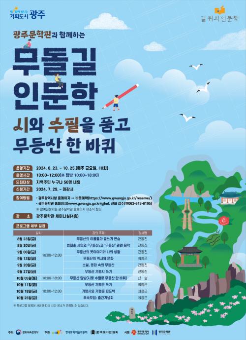 ÇÁ·Î±×·¥Àº ¡ã¹«µî»êÀÇ À̸§µé°ú ±Û¾²±â ¿¬½À ¡ã¹ü´ë¼ø ½ÃÀÎÀÇ ¡®¹«µî»ê¡¯°ú ¡®¹«µî»ê¡¯ °ü·Ã ¹®ÇÐ ¡ã¹«µî»êÀÇ ¿¾À̾߱â¿Í ³ªÀÇ »ýȰ ¡ã¹«µî»êÀÇ ¿ª»ç¿Í ¹®È µî 10°³ °Á·Π¿î¿µµÇ¸ç, 8¿ù 23ÀϺÎÅÍ 10¿ù 25ÀϱîÁö ¸ÅÁÖ ±Ý¿äÀÏ ¿ÀÀü 10½Ã ±¤ÁÖ¹®Çаü 4Ãþ ¼¼¹Ì³ª½Ç¿¡¼ ¹«·á·Î ÁøÇàµÈ´Ù.