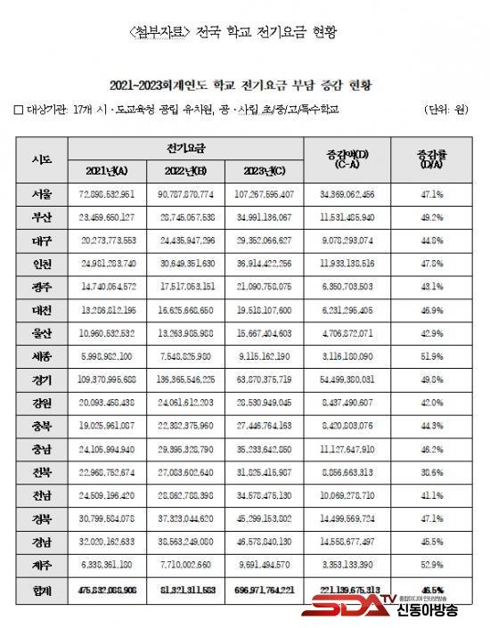 ±¹È¸ ±³À°À§¿øÈ¸ ¹é½Â¾Æ ÀÇ¿ø(´õºÒ¾î¹ÎÁÖ´ç)ÀÌ °ø°³ÇÑ ¡®2021~2023³âµµ Àü±¹ ±³À°Ã» Çб³ Àü±â¿ä±Ý ÇöȲ¡¯¿¡ µû¸£¸é, Àü±¹ °ø¸³À¯Ä¡¿ø, °ø»ç¸³ ÃÊÁß°í¡¤Æ¯¼öÇб³ÀÇ 2023³â Àü±â¿ä±Ý ºÎ´ãÀº 6,969¾ï¿øÀ¸·Î 2021³â 4,758¾ï¿ø ´ëºñ 2,211¾ï, 46.5% ±ÞÁõÇß´Ù.