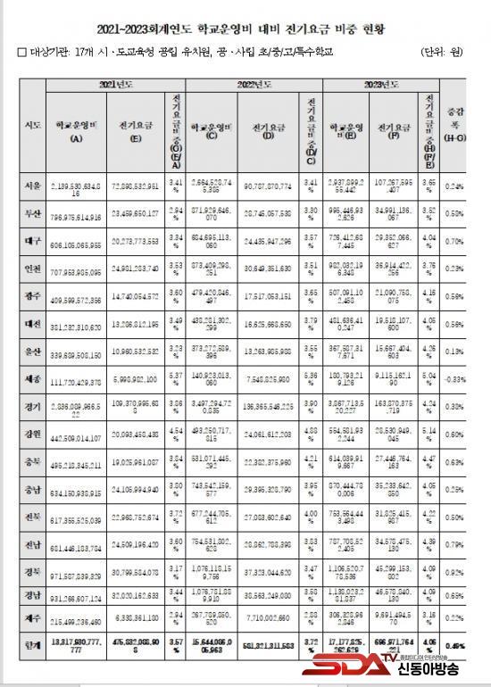 Àü±â¿ä±Ý ÆøÅºÀ¸·Î Àü±¹ Çб³¿î¿µºñ ³» Àü±â¿ä±Ý ºñÁßµµ Ä¿Á³´Ù. 2021³â 3.57%, 2022³â 3.72%, 2023³â 4.06%·Î 2³â»õ 0.5%°¡·® Áõ°¡ÇßÀ¸¸ç ¸Å³â Áõ°¡ÇÏ´Â Ãß¼¼´Ù.