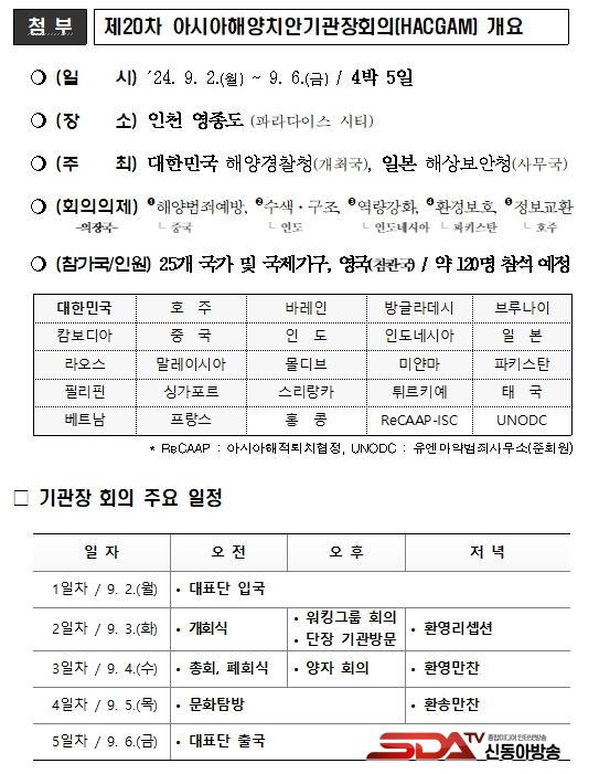 [½Åµ¿¾Æ¹æ¼Û ÀÎõ= À±¹Î½Ä±âÀÚ] ÇØ¾ç°æÂûû(ûÀå ±èÁ¾¿í)Àº ¿À´Â 9¿ù 2ÀϺÎÅÍ 6ÀϱîÁö ¼¼°è 26°³ ±¹°¡ ¹× ±¹Á¦±â±¸ÀÇ ÇØ¾ç°æÂû ±â°üÀåÀÌ Âü¼®ÇÏ´Â Á¦20Â÷ ¾Æ½Ã¾Æ ÇØ¾ç Ä¡¾È±â°üÀå ȸÀÇ(HACGAM, Heads of Asian Coast Guard Agencies Meeting)¸¦ ÀÎõ¿¡¼­ °³ÃÖÇÑ´Ù°í ¹àÇû´Ù.