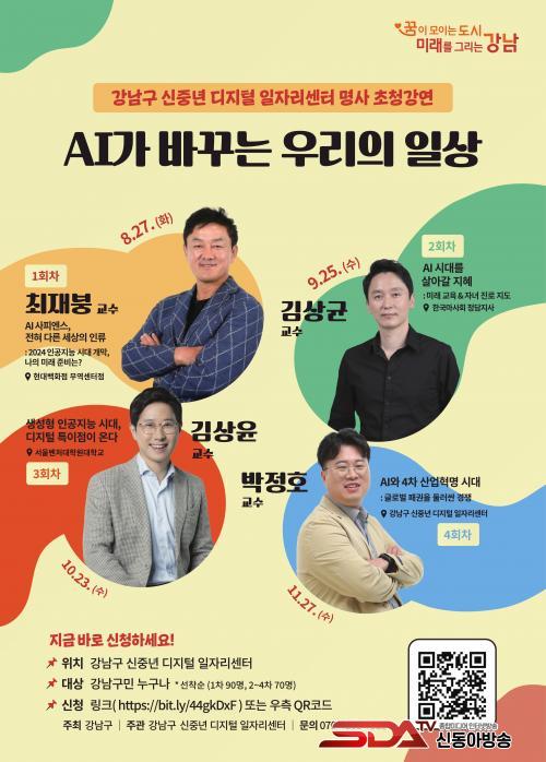 ¡ã1Â÷ °ÀÇ´Â 8¿ù 27ÀÏ 11½Ã~12½Ã 30ºÐ Çö´ë¹éÈÁ¡ ¹«¿ª¼¾ÅÍÁ¡(Å×Çì¶õ·Î 517)¿¡¼ ¼º±Õ°ü´ë ÃÖÀçºØ ±³¼ö°¡ ¡®2024³â ÀΰøÁö´É ½Ã´ë °³¸·, ³ªÀÇ ¹Ì·¡ Áغñ ¹æ¹ý¡¯À» ÁÖÁ¦·Î °¿¬ÇÑ´Ù. ¡ã2Â÷´Â 9¿ù 25ÀÏ 13½Ã 30ºÐ~15½Ã 30ºÐ Çѱ¹¸¶»çȸ û´ãÁö»ç(µµ»ê´ë·Î 529)¿¡¼ ¿¬¼¼´ëÇб³ ±è»ó±Õ ±³¼ö¿Í ÇÔ²² AI ½Ã´ëÀÇ ¹Ì·¡±³À°°ú ÀÚ³à Áø·Î Áöµµ¿¡ ´ëÇÑ °í¹ÎÀ» ³ª´ ¿¹Á¤ÀÌ´Ù. ¡ã3Â÷´Â 10¿ù 23ÀÏ 14½Ã~15½Ã 30ºÐ ¼¿ïº¥Ã³´ëÇпø´ëÇб³(ºÀÀº»ç·Î 405)¿¡¼ Áß¾Ó´ëÇб³ ±è»óÀ± ±³¼ö°¡ êGPT¸¦ Ȱ¿ëÇÑ ÀΰøÁö´É ºÐ¾ß Àü¸Á°ú ÄÜÅÙÃ÷ »ê¾÷¿¡ ¹ÌÄ¥ ¿µÇâ¿¡ ´ëÇØ ¾Ë·ÁÁØ´Ù. ¡ã4Â÷´Â 11¿ù 27ÀÏ 14½Ã~15½Ã 30ºÐ °³²±¸ ½ÅÁ߳⠵ðÁöÅÐ ÀÏÀÚ¸®¼¾ÅÍ(Çе¿·Î 343)¿¡¼ ¸íÁö´ëÇб³ ¹ÚÁ¤È£ ±³¼ö°¡ 4Â÷ »ê¾÷Çõ¸íÀÌ ±Û·Î¹ú °æÁ¦ ¹× »ê¾÷¿¡ ¹ÌÄ¡´Â ¿µÇâ°ú ¹Ì·¡ ½Å»ê¾÷ Æ®·»µå º¯È¿¡ ´ëÇØ °ÀÇÇÑ´Ù. 1Â÷ °ÀÇ´Â 90¸í, 2~4Â÷ °ÀÇ´Â 70¸íÀ» ¼±Âø¼øÀ¸·Î ¸ðÁýÇÑ´Ù. Ư° Âü¿©¸¦ ¿øÇÏ´Â ±¸¹ÎÀº Æ÷½ºÅÍÀÇ QRÄڵ带 ÅëÇØ »çÀü ½ÅÃ»ÇØ¾ß ÇÑ´Ù.