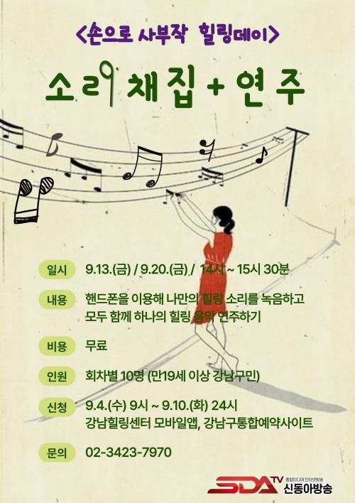 ¼Ò¸® äÁý ÇÁ·Î±×·¥Àº ³ª¸¸ÀÇ Èú¸µ ¼Ò¸®¸¦ ÇÚµåÆù¿¡ ³ìÀ½Çϰí, Âü°¡ÀÚµéÀÌ Ã¤ÁýÇÑ ¼Ò¸®¸¦ ¸ð¾Æ ÇϳªÀÇ À½¾ÇÀ¸·Î ¸¸µå´Â ÀÌ»ö °­Á´Ù. Çѱ¹´ëÁßÀ½¾Ç»ó ÀçÁî&Å©·Î½º¿À¹ö ºÎ¹®À» ¼ö»óÇÏ°í ´º¿å OMI±¹Á¦¾ÆÆ®¼¾ÅÍ ·¹Áö´ø½Ã ¾ÆÆ¼½ºÆ®·Î ¼±Á¤µÅ ¼­¿ï½Ã¸³¹Ì¼ú°ü µî¿¡¼­ ´Ù¾çÇÑ ÇÁ·Î±×·¥À» ¿î¿µÇÑ Áö¹Ú ÀÛ°¡¸¦ ¼·¿ÜÇß´Ù. ¼ö¾÷Àº °³Æ÷Á¡(»ï¼º·Î 3±æ 39)¿¡¼­ 9¿ù 13ÀÏ, 20ÀÏ 14½Ã~15½Ã 30ºÐ¿¡ ÁøÇàÇÑ´Ù.