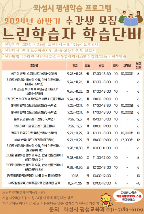 À̹ø ÇϹݱ⠸ðÁý°Á´ ÃÊÁß°íµîÇлý ´ë»óÀÇ ½ºÇÇÄ¡, ¹®ÇØ, ÄÄÇ»ÅÍ È°¿ë µî 13°³ °ÁÂ¿Í ´À¸°ÇнÀÀÚ º¸È£ÀÚ ´ë»óÀÇ ºÎ¸ðÈú¸µ±³À° 2°³ °Á·Π±¸¼ºµÇ¾î ÀÖÀ¸¸ç °¢ °Áº° ÀÏÁ¤, ±³À°Àå¼Ò, °»ç µî ÀÚ¼¼ÇÑ ³»¿ëÀº ȼº½ÃÅëÇÕ¿¹¾à½Ã½ºÅÛ(https://reserve.hscity.go.kr)À» ÅëÇØ È®ÀÎÇÏ¸é µÈ´Ù.