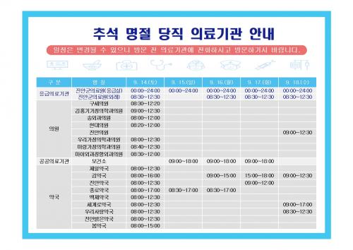 À̹ø Ãß¼® ¿¬ÈÞ ±â°£ ºñ»óÁø·á ±â°üÀº Áö¿ª ÀÀ±ÞÀÇ·á ±â°üÀÎ Áø¾È±ºÀÇ·á¿ø°ú °ü³» ÀÇ·á±â°ü 9°³¼Ò, ¾à±¹ 9°³¼Ò, º¸°Ç¼Ò 1°³¼Ò µîÀ¸·Î ÀÏÀÚº°¡¤½Ã°£´ëº°·Î ÁöÁ¤ ¿î¿µµÈ´Ù.