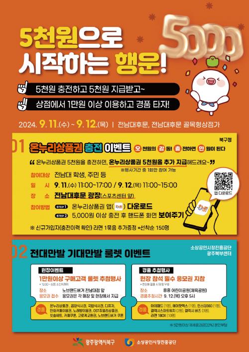 ¡ã¼Ò»ó°øÀνÃÀåÁøÈï°ø´Ü ºÏºÎ¼¾ÅÍ ¡ãÀü³²´ë ÈĹ® °ñ¸ñÇü»óÁ¡°¡ ¡ãÀü³²´ë ÃÑÇлýȸ¿Í Çù·ÂÇØ ÃßÁøµÇ´Â À̹ø Çà»ç´Â ¿Â´©¸®»óǰ±Ç(Ä«µåÇü) 5õ ¿ø ÀÌ»ó ±¸¸ÅÀÚ¿¡°Ô 5õ ¿øÀ» Ãß°¡ ÃæÀüÇØÁÖ´Â ¡®±¸¸Å º¸»ó À̺¥Æ®¡¯¿Í ¡®È«º¸ ºÎ½º¡¯ µîÀÌ ¿î¿µµÉ ¿¹Á¤ÀÌ´Ù.