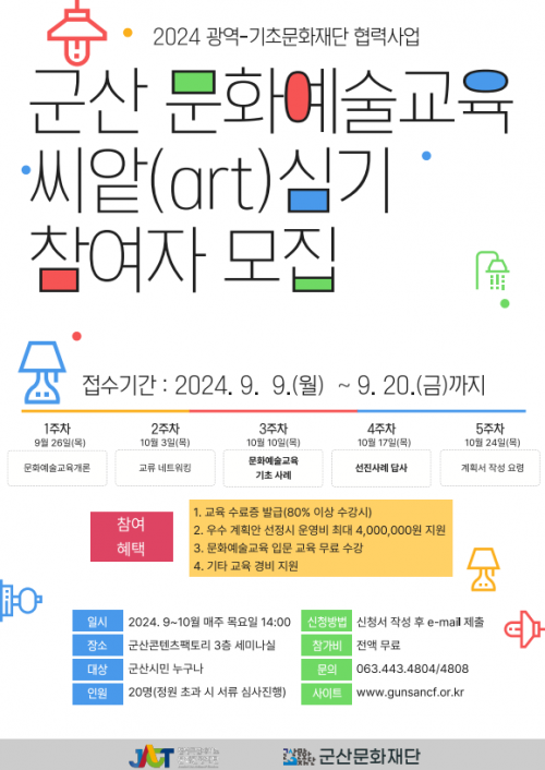 ¸ðÁý ÀοøÀº 5ÆÀ, ÃÑ 20¸íÀÌ¸ç ¸ðÁý ´ë»óÀº ¹®È¿¹¼ú±³À°¿¡ °ü½ÉÀÌ Àְųª ÇÁ·Î±×·¥À» °³¹ßÇÏ°í ¿î¿µÇϰíÀÚ ÇÏ´Â ±º»ê½Ã¹ÎÀÌ´Ù. ƯÈ÷ ¹®È¿¹¼ú ºÐ¾ß Ȱµ¿ °æÇèÀÌ ÀÖ´Â °æ¿ì ¿ì´ëµÈ´Ù.