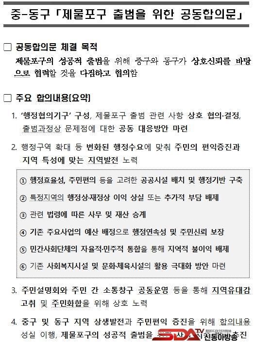 ÀÎõ±¤¿ª½Ã(½ÃÀå À¯Á¤º¹)´Â Áß±¸¿Í µ¿±¸°¡ 9¿ù 19ÀÏ ½Ãû ¿µ»óȸÀǽǿ¡¼ ¡®Á¦¹°Æ÷±¸ Ãâ¹üÀ» À§ÇÑ °øµ¿ÇÕÀǹ® ü°á½Ä¡¯À» °³ÃÖÇß´Ù°í ¹àÇû´Ù.