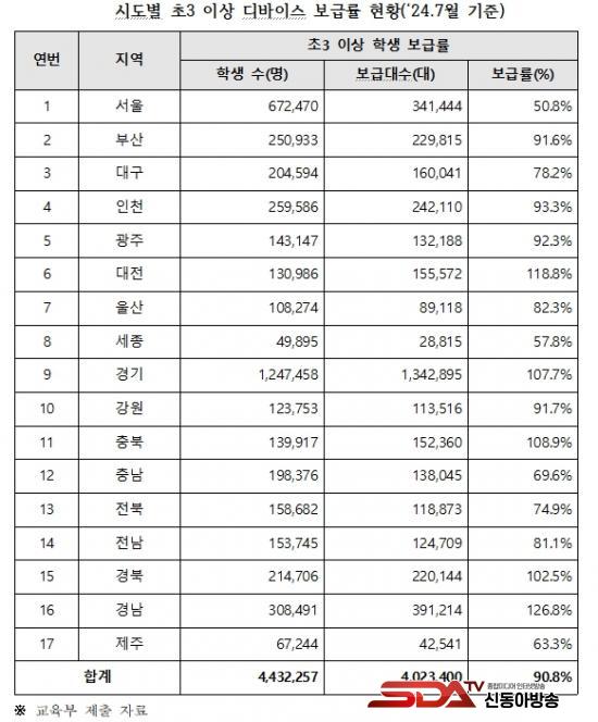 ´õºÒ¾î¹ÎÁÖ´ç ¹é½Â¾Æ ÀÇ¿øÀÌ °ø°³ÇÑ ÀÚ·á¿¡ µû¸£¸é, ÇöÀç ÃʵîÇб³ 3Çгâ ÀÌ»ó Çлýµé¿¡ ´ëÇÑ µð¹ÙÀ̽º º¸±Þ·üÀÇ ½Ãµµº° °ÝÂ÷°¡ »ó´çÈ÷ Å« °ÍÀ¸·Î µå·¯³µ´Ù. µð¹ÙÀ̽º º¸±Þ·üÀÌ ³ôÀº °æ³², ´ëÀü, ÃæºÏÀÇ °æ¿ì °¢°¢ º¸±Þ·üÀÌ 126.8%, 118.8%, 108.9%¿¡ ´ÞÇÏÁö¸¸, º¸±Þ·üÀÌ ³·Àº ¼¿ï, ¼¼Á¾, Á¦ÁÖ´Â °¢°¢ º¸±Þ·üÀÌ 50.8%, 57.8%, 63.3%¿¡ ºÒ°úÇß´Ù. ƯÈ÷, ¼¿ïÀÇ °æ¿ì, ³»±¸¿¬¼ö¸¦ ÃʰúÇÑ ³ëÆ®ºÏ°ú ÅÂºí¸´ÀÌ 16,543´ë¿¡ ´ÞÇÏ´Â µî ³ëÈÄÈµÈ ±â±â ±³Ã¼¿¡ ´ëÇÑ ºÎ´ãµµ »ó´çÇÒ °ÍÀ¸·Î ³ªÅ¸³µ´Ù.