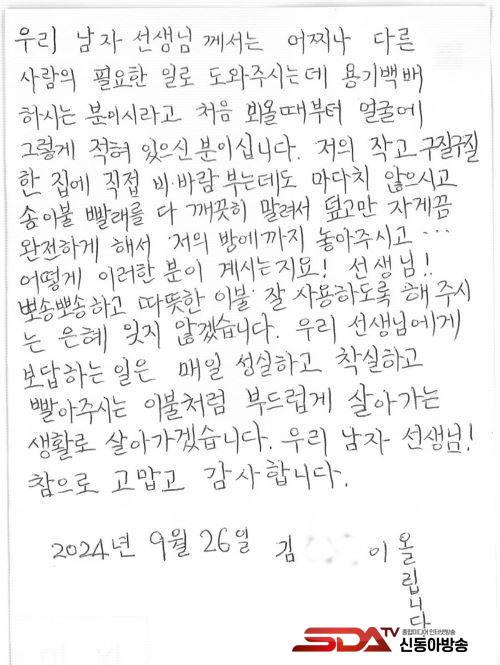 ÆíÁö¸¦ Àü´ÞÇÑ ¾î¸£½ÅÀº ¡°È¥ÀÚ¼´Â À̺ÒÀ» »¡°í ÇÞºµ¿¡ ³Î±âµµ ¾î·Á¿ü´Âµ¥ ±ú²ýÇÑ À̺ÒÀ» µ¤À» ¼ö ÀÖ¾î¼ ³Ê¹« °¨»çÇÏ´Ù¡±¸ç ¡°À̺ÒÀ» ¼ö°ÅÇÏ°í ¹è´ÞÇÏ´Â ºÐµéÀÌ Ä£ÀýÇØ ´öºÐ¿¡ ¿Ü·ÓÁö ¾Ê°í µû¶æÇÑ Á¤À» ´À³¥ ¼ö ÀÖ¾ú´Ù¡±°í ¸»Çß´Ù.