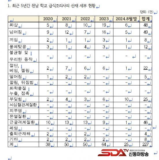 ±³À°ºÎ°¡ ±è¹®¼ö ÀÇ¿ø¿¡°Ô Á¦ÃâÇÑ ±¹Á¤°¨»ç ÀÚ·á¿¡ µû¸£¸é Àü¶ó³²µµ Çб³±Þ½Ä Á¶¸®Á¾»çÀÚ »êÀç ¹ß»ý °Ç¼ö´Â 2020³â 38°Ç, 2021³â 50°Ç, 2022³â 50°Ç, 2023³â, 64°Ç 2024³â 8¿ù ±âÁØ 25°ÇÀ¸·Î ¸Å³â ²÷ÀÓ¾øÀÌ ¹ß»ýÇϰí ÀÖ´Ù.