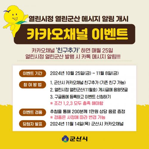 ±âȹ Çà»ç¿¡ Âü¿©Çϱâ À§Çؼ´Â ±º»ê½Ã īī¿À ä³Î Ä£±¸Ãß°¡ ÈÄ ¡®¿¸°½ÃÁ¤ ¿¸°±º»ê¡¯ 11¿ùÈ£ °Ô½Ã¹°¿¡ ÀÀ¿ø ´ñ±ÛÀ» ³²±â°í ±¸±Û ¼·ù ¾ç½ÄÀ» ÀÌ¿ëÇØ ½ÅûÇÏ¸ç ±âÁ¸ Ä£±¸µµ Âü¿©°¡´ÉÇÏ´Ù.
