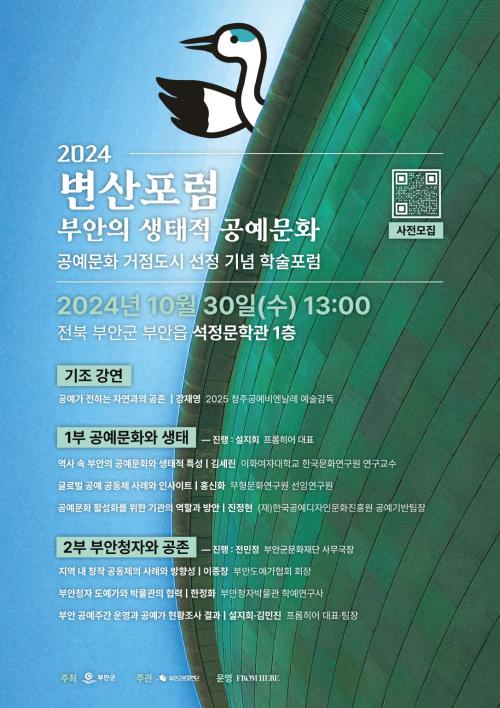 À̹ø <2024 º¯»êÆ÷·³ ºÎ¾ÈÀÇ »ýÅÂÀû °ø¿¹¹®È> ±âÁ¶ °¿¬Àº ûÁÖ°ø¿¹ºñ¿£³¯·¹ÀÇ °À翵 ¿¹¼ú°¨µ¶ÀÌ ¡®°ø¿¹°¡ ÀüÇÏ´Â ÀÚ¿¬°úÀÇ °øÁ¸¡¯À» ÁÖÁ¦·Î ¸Þ½ÃÁö¸¦ ÀüÇÒ ¿¹Á¤À̸ç, 1ºÎ¿¡¼´Â Çаè Àü¹®°¡µéÀ» ÅëÇØ °ø¿¹¹®ÈÀÇ Àü¹ÝÀûÀÎ È帧°ú »ç·ÊµéÀ» »ìÆìº¸°í, 2ºÎ¿¡¼´Â Áö¿ª ¿¹¼ú°¡¿Í ±â°üÀÇ Çù·ÂÀ» ÅëÇÑ ºÎ¾È ûÀÚ¿Í °øÁ¸À» Áß½ÉÀ¸·Î ³íÀǰ¡ ÀÌ·ç¾îÁú ¿¹Á¤ÀÌ´Ù.