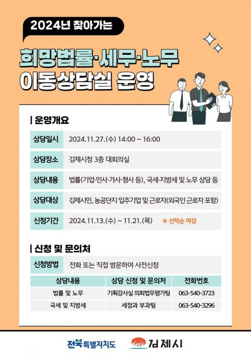 »ó´ãÀ» ¿øÇÏ´Â ½Ã¹Î°ú ±â¾÷Àº ¿À´Â 21ÀϱîÁö »çÀü ½ÅûÇÏ¿©¾ß Çϸç, ¹ý·ü ¹× ³ë¹« »ó´ãÀº ±âȹ°¨»ç½Ç(063-540-3723), ¼¼¹«»ó´ãÀº ¼¼Á¤°ú(063-540-3296)·Î ÀüÈÇϰųª Á÷Á¢ ¹æ¹®ÇØ ½ÅûÇÒ ¼ö ÀÖ´Ù.