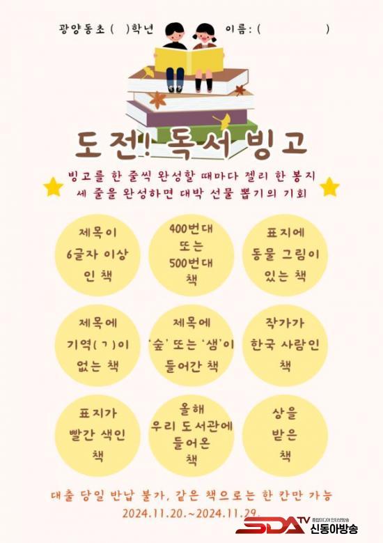 [½Åµ¿¾Æ¹æ¼Û Àü³²±¤¾ç=À̽ŵ¿±âÀÚ] ±¤¾çµ¿ÃʵîÇб³´Â 11¿ù 20ÀϺÎÅÍ 29ÀϱîÁö µµ¼°ü¿¡¼ Àü±³»ýÀ» ´ë»óÀ¸·Î ´Ù¾çÇÑ µ¶¼±³À° ÇÁ·Î±×·¥À» ¿î¿µÇÏ¿´´Ù. ¡®±¸ÇØÁà! ¿¬Ã¼!¡¯, ¡®µµÀü! µ¶¼ ºù°í¡¯, ¡®ÀáÀڴ å ±ú¿ì±â¡¯, ¡®°¡À» Ã¥°¥ÇÇ¡¯ µî ÇлýµéÀÇ µ¶¼ Èï¹Ì¸¦ ³ô¿© µ¶¼¸¦ »ýȰÈÇÒ ¼ö ÀÖµµ·Ï ÁغñÇÑ Æ¯º°ÇÑ Çà»çµéÀÌ ´«±æÀ» ²ø¾ú´Ù.