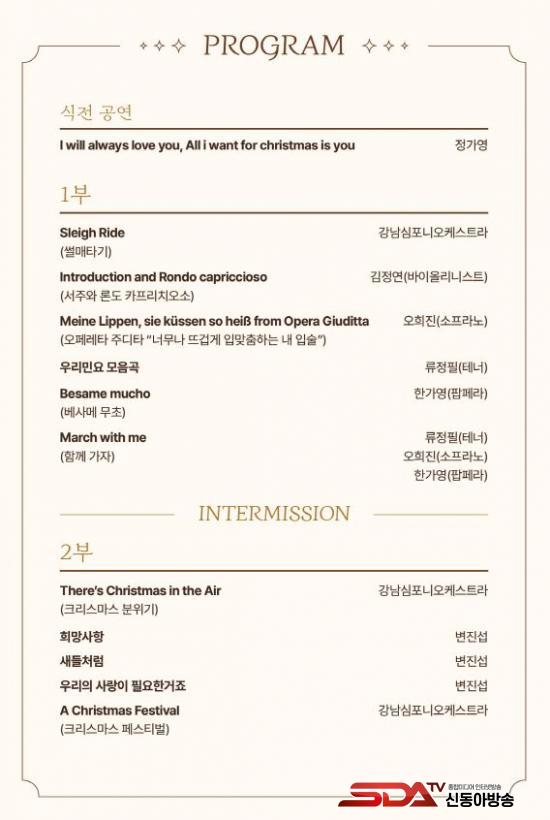 °ø¿¬Àº ¡®Sleigh Ride(½ä¸ÅŸ±â)¡¯¿Í ¡®March with me(ÇÔ²² °¡ÀÚ)¡¯¸¦ Æ÷ÇÔÇÑ Å¬·¡½Ä ¸í°îºÎÅÍ Çѱ¹ ¹Î¿ä¿Í ÆË±îÁö ´Ù¾çÇÑ ·¹ÆÛÅ丮·Î ±¸¼ºµÈ´Ù. ´ë¿¹¹è½Ç 1750¼® ±Ô¸ðÀÇ °ø¿¬ÀåÀº »çÀü ¿¹¾à ¾øÀÌ ¼±Âø¼øÀ¸·Î ÀÔÀå °¡´ÉÇϸç, °ü¶÷·á´Â ¹«·á´Ù. 7¼¼ ÀÌ»óÀ̶ó¸é ´©±¸³ª °ü¶÷ÇÒ ¼ö ÀÖ´Ù.