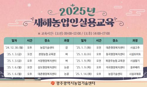 ±³À° Àå¼Ò´Â ±¤ÁÖ³ó¾÷±â¼ú¼¾ÅÍ ±³À°°ü, ¼Ã¢‧»ïµµ‧´ëÃÌ‧µ¿°î‧¼®°îµ¿ ÇàÁ¤º¹Áö¼¾ÅÍ, º»·®‧ºÏ±¤ÁÖ³óÇù ±³À°Àå µîÀ̸ç, ±³À° ÀÏÁ¤º°·Î ´Ù¸£´Ù. ÀÏÁ¤°ú Àå¼Ò µî ÀÚ¼¼ÇÑ »çÇ×Àº ±¤ÁÖ³ó¾÷±â¼ú¼¾ÅÍ ´©¸®Áý¿¡¼ È®ÀÎÇϰųª ±¤ÁÖ³ó¾÷±â¼ú¼¾ÅÍ ÀηÂÀ°¼ºÆÀ(062-613-5273)À¸·Î ¹®ÀÇÇÏ¸é µÈ´Ù.