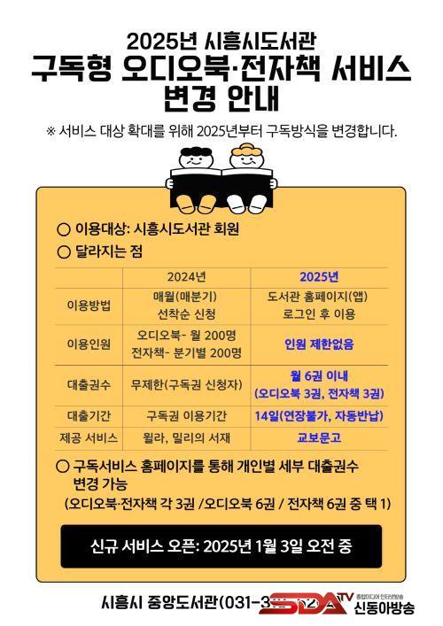 2025³âºÎÅÍ´Â º°µµÀÇ ½Åû ÀýÂ÷ ¾øÀÌ ½ÃÈï½Ãµµ¼°ü ȸ¿øÀ̶ó¸é ´©±¸³ª ÀüÀÚÃ¥°ú ¿Àµð¿ÀºÏÀ» ÀÚÀ¯·Ó°Ô ÀÌ¿ëÇÒ ¼ö ÀÖ´Ù. ´Ù¸¸, ¿øÈ°ÇÑ ¼ºñ½º ¿î¿µÀ» À§ÇØ 1ÀÎ´ç ¿ù ´ëÃâ °¡´É ±Ç¼ö´Â 6±ÇÀ¸·Î Á¦ÇѵǸç, ¼ºñ½º ÀÌ¿ëÀº 1¿ù 3ÀϺÎÅÍ °¡´ÉÇÏ´Ù.
