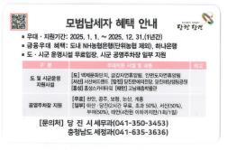 ÀÌ ¹Û¿¡ ÃæÃ»³²µµ ¸ð¹ü³³¼¼ÀÚ ¿ì´ë ¹× Áö¿ø¿¡ °üÇÑ »çÇ×Àº ÃæÃ»³²µµ ¹× ÃæÃ»³²µµ µµ³» ½Ã±ºÀÇ ÀϺΠ¿î¿µ ½Ã¼³ ¹× °ø¿µÁÖÂ÷Àå ¹«·á ÀÌ¿ë ¶Ç´Â °¨¸é ÇýÅÃÀÌ ÀÖÀ¸¸ç, ÀÚ¼¼ÇÑ »çÇ×Àº ÃæÃ»³²µµ ´©¸®ÁýÀ» Âü°íÇϰųª ´çÁø½Ãû ¼¼¹«°ú ¼¼Á¤ÆÀ(¢Î041-350-3453)¿¡ ¹®ÀÇÇÏ¸é µÈ´Ù.