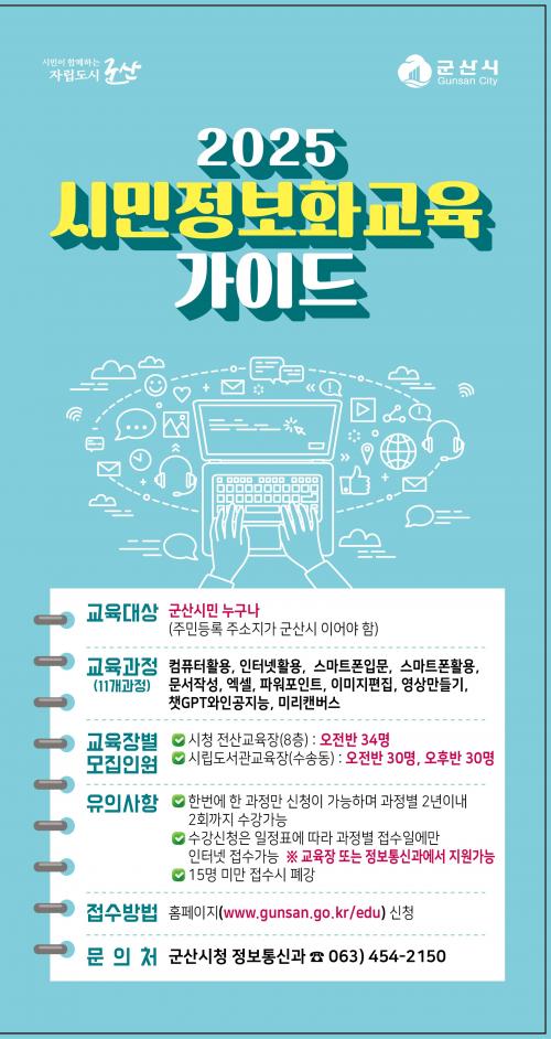 ±³À° Âü¿©¸¦ ¿øÇÏ´Â ±º»ê½Ã¹ÎÀÌ¸é ´©±¸³ª ±º»ê½Ã ´©¸®ÁýÀ» ÅëÇØ ¿øÇÏ´Â °úÁ¤¿¡ Âü¿©ÇÒ ¼ö ÀÖ´Ù. ±³À°Àå¼Ò´Â ±º»ê½Ãû Àü»ê±³À°Àå(8Ãþ)°ú ¼ö¼Ûµ¿ ½Ã¸³µµ¼°ü(4Ãþ) Àü»ê±³À°Àå 2°³¼Ò¿¡¼ µ¿½Ã ¿î¿µµÇ¸ç Àü¹® °»çÀÇ °ÀÇ·Î ÁøÇàµÈ´Ù.
