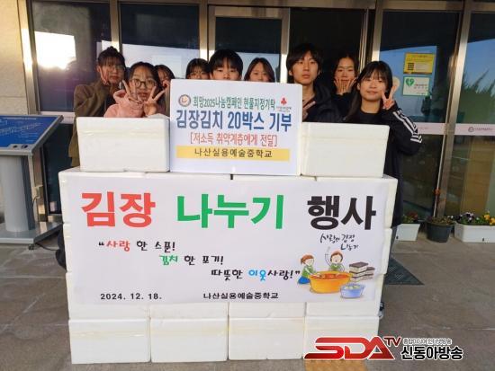 ³ª»ê½Ç¿ë¿¹¼úÁßÇб³´Â 12¿ù 19ÀÏ, Àü±³»ýÀÌ Á÷Á¢ Àç¹èÇÑ ¹«¿Í ¹èÃß·Î ±èÀåÀ» ´ã°¡ ³ª»ê¸é µ¶°Å³ëÀÎ 20¸í¿¡°Ô ³ª´©´Â µû¶æÇÑ ±èÀå ³ª´® Çà»ç¸¦ ÁøÇàÇß´Ù.