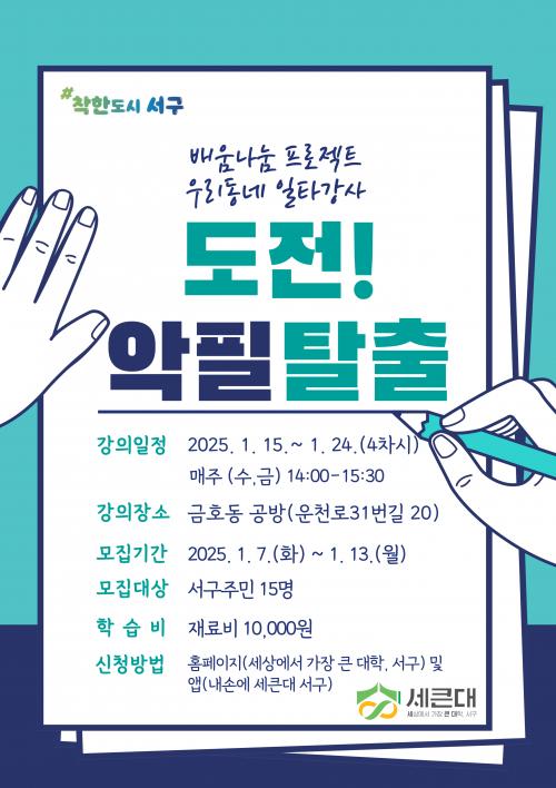 1¿ù °Á´¡®µµÀü! ¾ÇÇÊÅ»Ã⡯À̶ó´Â ÁÖÁ¦·Î ÁøÇàµÈ´Ù. °ü³» ±Û¾¾°ø¹æÀ» ¿î¿µÇϸç ÇÊü ±³Á¤ÀÇ ³ëÇϿ츦 ½×¾Æ¿Â °í¼ö°¡ ÀÏŸ°»ç·Î ³ª¼ 4ȸ ¸¸¿¡ ¾ÇÇÊÀ» ±³Á¤ÇÒ ¼ö ÀÖ´Â ¹æ¹ýÀ» ¼Ò°³ÇÑ´Ù. Âü°¡ÀÚµéÀº ½Ç¿ëÀûÀÎ ±Û¾¾ ±³Á¤¹ýÀ» ¹è¿ì´Â µ¿½Ã¿¡, ²É°ú ¼ÒǰÀ» Ȱ¿ëÇØ ÀڽŸ¸ÀÇ ÇÑ±Û ÀÛǰÀ» ¿Ï¼ºÇÏ´Â ½Ã°£À» °¡Áú ¿¹Á¤ÀÌ´Ù.