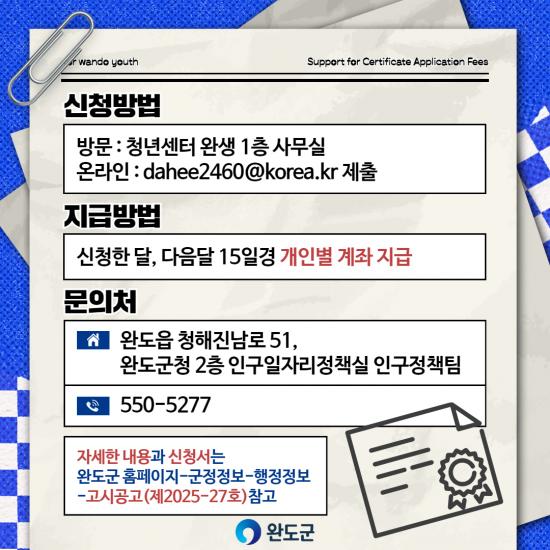 Áö¿øÀ» ¿øÇϴ û³âÀº ÀÚ°ÝÁõ ½ÃÇè¿¡ ÀÀ½ÃÇÑ ÈÄ ±¸ºñ ¼·ù¸¦ ÁöÂüÇØ ¸Å¿ù 1~10ÀÏ(1¿ùÀº 8ÀÏ~ 15ÀÏ)¿¡ ¿ÏµµÃ»³â¼¾ÅÍ ¡®¿Ï»ý¡¯¿¡ ¹æ¹®Çϰųª À̸ÞÀÏ(dahee2460@korea.kr)·Î ½ÅûÇÏ¸é µÈ´Ù.