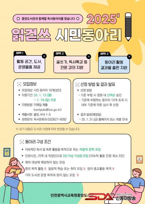 ÀÎõ½Ã¹Î 5¸í ÀÌ»óÀ¸·Î ±¸¼ºµÈ µ¿¾Æ¸®´Â ´©±¸³ª ½ÅûÇÒ ¼ö ÀÖÀ¸¸ç, ½Åû ¹æ¹ýÀº Áß¾Óµµ¼°ü ´©¸®Áý(lib.ice.go.kr/jungang) °øÁö »çÇ׿¡¼ È®ÀÎÇÒ ¼ö ÀÖ´Ù.