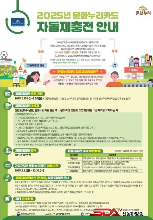 ¡Û ´Ù¸¸ Àü³âµµ(2024³âµµ) ¹®È´©¸®Ä«µå Áö¿ø±ÝÀ» ÇÑ ¹øµµ »ç¿ëÇÏÁö ¾Ê¾Ò°Å³ª Ä«µå À¯È¿±â°£ÀÌ 2025³â 1¿ù±îÁö¶ó¸é ÀÚµ¿ÀçÃæÀü ´ë»óÀÚ¿¡¼ Á¦¿ÜµÈ´Ù.