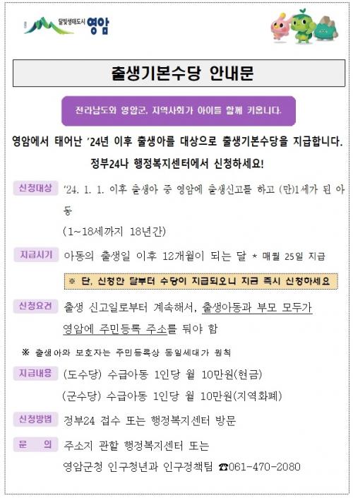 Àü¶ó³²µµ¿Í ¿µ¾Ï±ºÀÇ Ãâ»ý±âº»¼ö´çÀº ¼Òµæ ¼öÁذú °ü°è¾øÀÌ 2024³â ÀÌÈÄ Ãâ»ýÇØ Àü³²¿¡ Ãâ»ý½Å°í¸¦ ÇÏ°í ¿µ¾Ï±º¿¡ ÁÖ¼Ò¸¦ µÐ 1¼¼ ¾Æµ¿¿¡°Ô Áö±ÞµÈ´Ù.