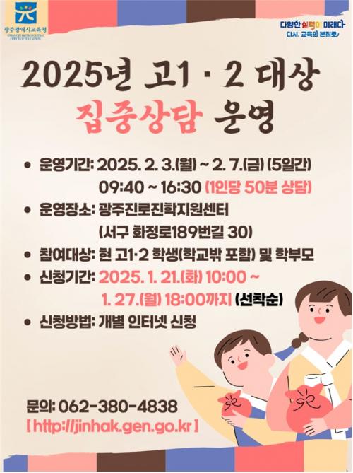 [½Åµ¿¾Æ¹æ¼Û=±èÀçÂù±âÀÚ] ±¤Áֽñ³À°Ã»(±³À°°¨ ÀÌÁ¤¼±)Àº 2025Çг⵵¸¦ ¸Â¾Æ °íµîÇб³ 1¡¤2ÇгâÀ» ´ë»óÀ¸·Î ÁýÁß ÁøÇлó´ãÀ» ½Ç½ÃÇÑ´Ù.