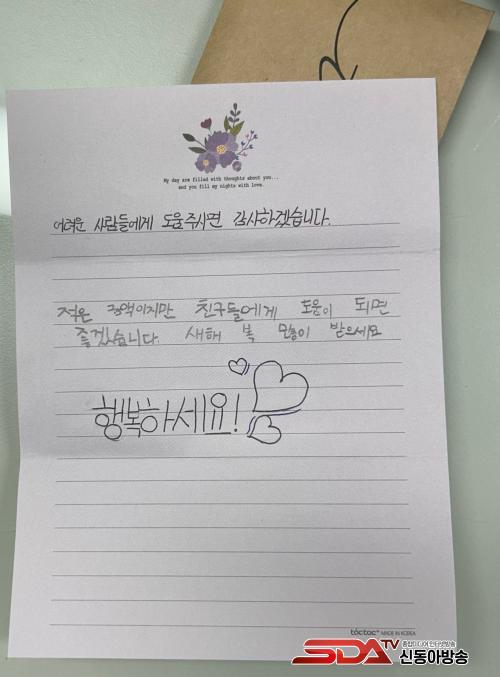 ³²¸ÅÀÇ ÆíÁö¿¡´Â ¡°¾î·Á¿î »ç¶÷µé¿¡°Ô µµ¿òÀ» ÁÖ½Ã¸é °¨»çÇϰڽÀ´Ï´Ù. ÀûÀº ±Ý¾×ÀÌÁö¸¸ Ä£±¸µé¿¡°Ô µµ¿òÀÌ µÇ¸é ÁÁ°Ú½À´Ï´Ù. »õÇØ º¹ ¸¹ÀÌ ¹ÞÀ¸¼¼¿ä. ÇູÇϼ¼¿ä¡±¶ó°í ¾²¿© ÀÖ¾ú´Ù.