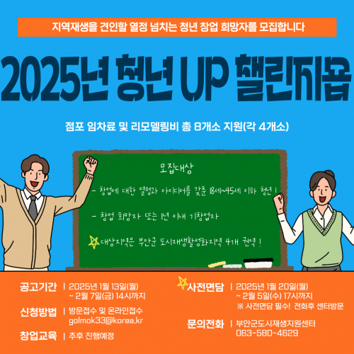 ½Åû ±â°£Àº °ø°íÀϷκÎÅÍ ¿À´Â 2¿ù 7ÀϱîÁöÀ̸ç, Áö¿ø»ç¾÷ ½Åû¼ Á¦Ãâ Àü »çÀü»ó´ãÀº Çʼö·Î 1¿ù 20ÀϺÎÅÍ 2¿ù 5ÀϱîÁöÀÌ´Ù. »ç¾÷ ½Åû¿¡ ´ëÇÑ »çÇ×Àº ºÎ¾È±º ȨÆäÀÌÁö °ø°í È®ÀÎ ¹× ºÎ¾È±ºµµ½ÃÀç»ýÁö¿ø¼¾ÅÍ·Î ¹®ÀÇÇÏ¸é µÈ´Ù.