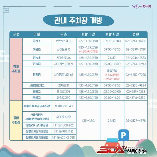 ¹æ¹®°´, ¿ª±Í¼º°´ µîÀÇ ÁÖÂ÷ ÆíÀǸ¦ À§ÇØ 25ÀϺÎÅÍ 30ÀϱîÁö 6Àϰ£ °ü³» Çб³ ¹× °ø¿µÁÖÂ÷Àå 13°³¼Ò¸¦ ¹«·á·Î Àӽð³¹æÇÑ´Ù. ÇØ´ç ÁÖÂ÷ÀåÀº ±ºÀÚÃʵîÇб³¸¦ Æ÷ÇÔÇÑ ÃÊ¡¤Áß¡¤°íµîÇб³ 8°³¼Ò¿Í Á¤¸ªÃµ º¹°³°ø¿µÁÖÂ÷Àå µî 5°³ °ø¿µÁÖÂ÷ÀåÀ¸·Î, ±¸ ´©¸®Áý ¶Ç´Â ÇàÁ¤¾ÈÀüºÎ¿¡¼­ ¿î¿µÇÏ´Â °øÀ¯´©¸® »çÀÌÆ®¸¦ ÅëÇØ È®ÀÎÇÒ ¼ö ÀÖ´Ù.