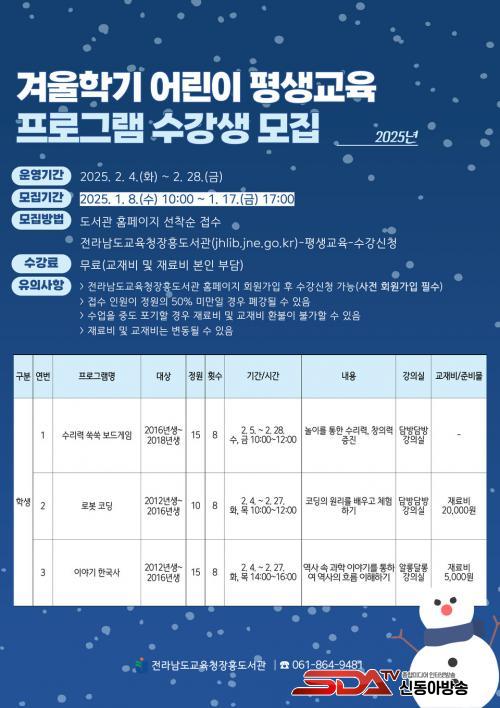 [½Åµ¿¾Æ¹æ¼Û Àü³²ÀåÈï=À̽ŵ¿±âÀÚ] Àü¶ó³²µµ±³À°Ã»ÀåÈïµµ¼­°üÀº °Ü¿ï¹æÇÐÀ» ¸Â¾Æ ´Ù¾çÇÑ ±³À° ±âȸ¸¦ Á¦°øÇϰíÀÚ ¿À´Â 2¿ù 4ÀÏ(È­)ºÎÅÍ °Ü¿ïÇб⠾ÀÌ Æò»ý±³À° ÇÁ·Î±×·¥À» ¿î¿µÇÑ´Ù.