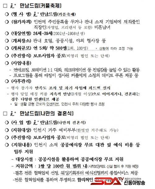 ¡®Ä¿ÇÃÃàÁ¦¡¯´Â ÀÎõ¿¡ °ÅÁÖÇϰųª Á÷ÀåÀ» µÐ ¹ÌÈ¥³²³à(24~39¼¼)µé¿¡°Ô ÀÚ¿¬½º·¯¿î ¸¸³²ÀÇ ±âȸ¸¦ Á¦°øÇÏ´Â Çà»ç·Î, 1ȸ´ç 100¸í¾¿ ¿¬°£ 5Â÷·Ê ¿î¿µµÉ ¿¹Á¤ÀÌ´Ù. ¡®³ª¸¸ÀÇ °áÈ¥½Ä¡¯Àº ÀÎõ ¼ÒÀç °ø°ø¿¹½ÄÀåÀ» ÀÌ¿ëÇÒ °æ¿ì Àå¼Ò¸¦ ¹«·á·Î Á¦°øÇϰí, °áÈ¥½Ä ºñ¿ë ÀϺÎ(ÃÖ´ë 100¸¸ ¿ø)¸¦ Áö¿øÇÏ´Â »ç¾÷À¸·Î, ÀÎõ¿¡ °ÅÁÖÇÏ´Â ¿¹ºñºÎºÎ°¡ ÇÕ¸®ÀûÀÎ ºñ¿ëÀ¸·Î ÀÇ¹Ì ÀÖ´Â °áÈ¥½ÄÀ» ¿Ã¸± ¼ö ÀÖµµ·Ï µ½´Â´Ù. ÀÌ »ç¾÷µéÀº ¿À´Â 6¿ùºÎÅÍ º»°Ý ÃßÁøµÉ ¿¹Á¤ÀÌ´Ù.
