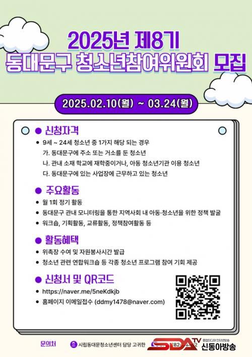 ¸ðÁý ´ë»óÀº µ¿´ë¹®±¸¿¡ °ÅÁÖÇϰųª µ¿´ë¹®±¸ ¼ÒÀç Çб³¿¡ ÀçÇÐ ÁßÀÎ 9¼¼ºÎÅÍ 24¼¼±îÁöÀÇ Ã»¼Ò³âÀ̸ç, ÃÑ 20¸í ³»¿Ü¸¦ ¼±¹ßÇÒ ¿¹Á¤ÀÌ´Ù.