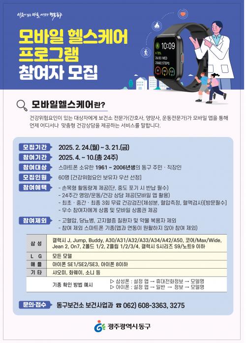 »ç¾÷ ´ë»óÀÚ·Î ¼±Á¤µÇ¸é ¼Õ¸ñÇü ½º¸¶Æ®¿öÄ¡°¡ Á¦°øµÇ¸ç 6°³¿ù µ¿¾È °Ç°°ËÁø°ú ¸ÂÃãÇü °Ç°»ó´ãÀ» ¹ÞÀ» ¼ö ÀÖ´Ù. Âü¿©¸¦ ¿øÇÏ´Â °æ¿ì µ¿±¸ º¸°Ç¼Ò º¸°Ç»ç¾÷°ú·Î ¹®ÀÇ¡¤Á¢¼ö(¢Ï062-608-3363¡¤3275)ÇÏ¸é µÈ´Ù.
