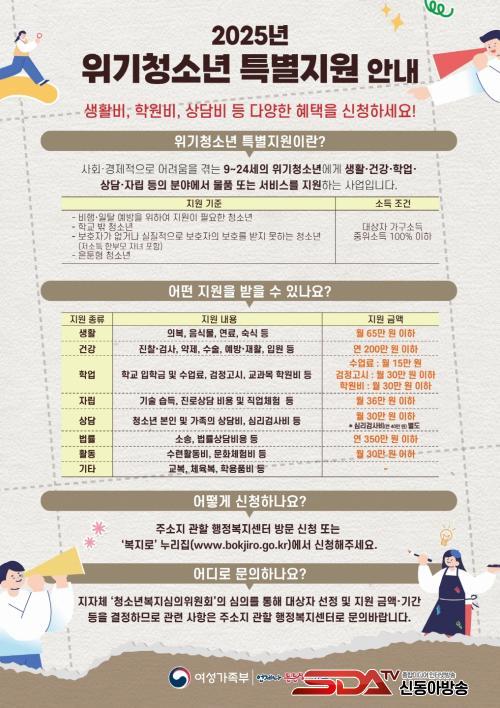 Áö¿ø ´ë»óÀº °¡±¸ ÁßÀ§¼Òµæ 100% ÀÌÇÏÀÇ 9¼¼~24¼¼ °ü³» û¼Ò³âÀ¸·Î ¡®Ã»¼Ò³âº¹ÁöÁö¿ø¹ý¡¯¿¡ µû¸¥ ºñÇà¤ýÀÏÅ» ¿¹¹æÀ» À§ÇØ Áö¿øÀÌ ÇÊ¿äÇÑ Ã»¼Ò³â, ¡®Çб³ ¹Û û¼Ò³â Áö¿ø¿¡ °üÇÑ ¹ý·ü¡¯¿¡ µû¸¥ Çб³ ¹Û û¼Ò³âÀÌ´Ù.