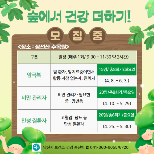 ¸ðÁý ´ë»óÀº ¾Ï ȯÀÚ 15¸í, ¸¸¼ºÁúȯÀÚ 20¸í, ºñ¸¸ °ü¸®ÀÚ 20¸íÀ¸·Î, ½£¼Ó Æ¯È ÇÁ·Î±×·¥ÀÎ ¡â³» ¸¶À½ Áöµµ ±×¸®±â ¡â½£ ¸í»ó ¡â½£±æ °È±â ¡â½£¼Ó ¿ä°¡ ÇÁ·Î±×·¥ µî ÁÖ 1ȸ ¿ÀÀü 2½Ã°£¾¿ ¿î¿µÇÑ´Ù.