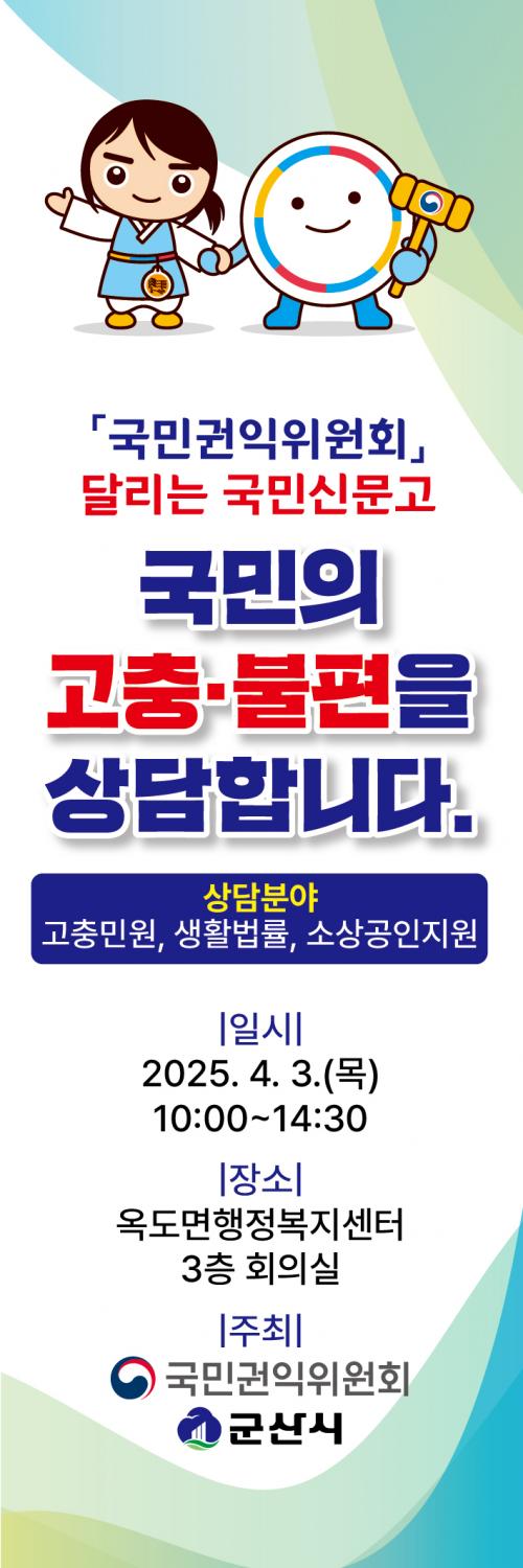 »ó´ã¿¡´Â ±¹¹Î±ÇÀÍÀ§¿øÈ¸ Àü¹® Á¶»ç°üÀ» ºñ·ÔÇØ ¼Ò»ó°øÀνÃÀåÁøÈï°ø´Ü, Çѱ¹±¹ÅäÁ¤º¸°ø»ç Çù¾÷ ±â°ü °ü°èÀÚ°¡ Âü¿©ÇØ ¸ðµç ÇàÁ¤ ºÐ¾ß¸¦ ´ë»óÀ¸·Î ÁøÇàÇÑ´Ù. ƯÈ÷ ¡ã°íÃæ ¹Î¿ø »ó´ã ¡ã¼Ò»ó°øÀÎ °æ¿µ‧Áö¿ø ¡ã»ýȰ¹ý·ü »ó´ã µîÀ» ÁßÁ¡ÀûÀ¸·Î ´Ù·ê ¿¹Á¤ÀÌ´Ù.