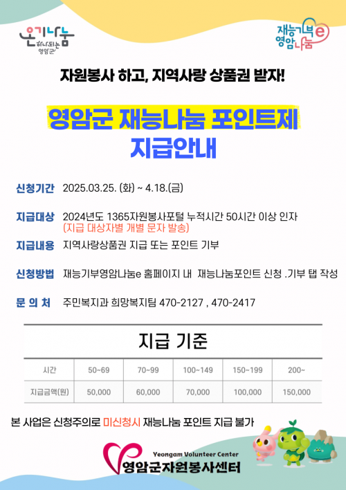 Æ÷ÀÎÆ® ½ÅûÀº ¡®Àç´É±âºÎ ¿µ¾Ï³ª´®e¡¯ ȨÆäÀÌÁö¿¡¼ ÇÒ ¼ö ÀÖ°í, ÀÎÁ¤ ºÀ»ç ½Ã°£¿¡ µû¶ó ¿µ¾Ï±ºÀº 5~15¸¸¿øÀÇ Áö¿ª»ç¶û»óǰ±ÇÀ» Á¦°øÇÒ ¿¹Á¤ÀÌ´Ù.