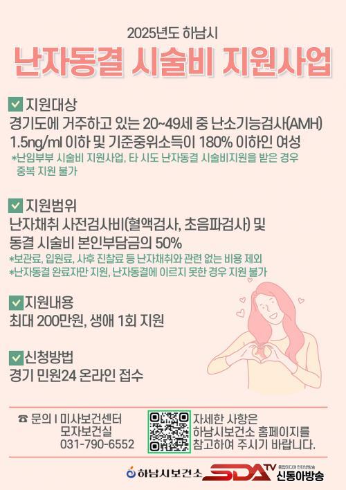 Áö¿ø ´ë»óÀº °æ±âµµ¿¡ °ÅÁÖÇÏ´Â 20¼¼ºÎÅÍ 49¼¼±îÁö(¿¬³ªÀÌ ±âÁØ)ÀÇ ¿©¼ºÀ¸·Î, ³­¼Ò±â´É°Ë»ç(AMH) ¼öÄ¡°¡ 1.5ng/ml ÀÌÇÏÀ̰í, °¡±¸ ¼ÒµæÀÌ ±âÁØÁßÀ§¼Òµæ 180% ÀÌÇÏÀÏ °æ¿ì ½Åû °¡´ÉÇÏ´Ù. 2025³â ±âÁØ °¡±¸¿ø ¼öº° ÁßÀ§¼Òµæ 180%´Â 1ÀÎ °¡±¸ ¾à 430¸¸ ¿ø, 2ÀÎ °¡±¸ ¾à 707¸¸ ¿ø, 3ÀÎ °¡±¸ ¾à 904¸¸ ¿ø, 4ÀÎ °¡±¸ ¾à 1,097¸¸ ¿ø ¼öÁØÀÌ´Ù.