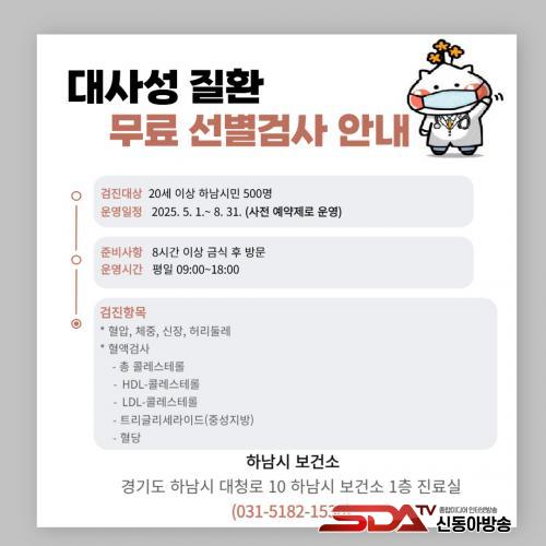 °Ë»ç´Â Çϳ²½Ãº¸°Ç¼Ò 1Ãþ Áø·á½Ç¿¡¼ ÁøÇàµÇ¸ç, 20¼¼ ÀÌ»ó Çϳ²½Ã¹Î 500¸íÀ» ´ë»óÀ¸·Î »çÀü ¿¹¾àÀ» ÅëÇØ ÀÌ·ïÁø´Ù. °ËÁø Ç׸ñÀº ÃÑ 9Á¾À¸·Î ÃÑÄÝ·¹½ºÅ×·Ñ, HDLÄÝ·¹½ºÅ×·Ñ, LDLÄÝ·¹½ºÅ×·Ñ, Æ®¸®±Û¸®¼¼¶óÀ̵å, Ç÷´ç, Ç÷¾Ð, üÁß, ½ÅÀå, Ç㸮µÑ·¹ µîÀ̸ç, ¸ðµç Ç׸ñÀº ¹«·á·Î Á¦°øµÈ´Ù.