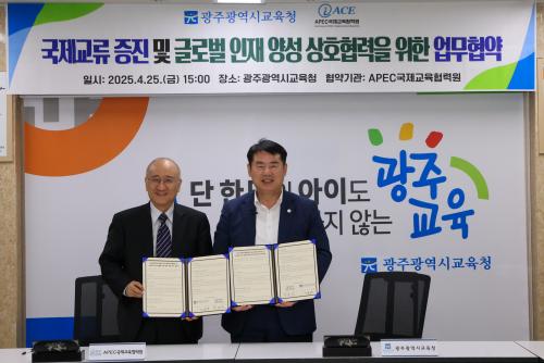 ÀÌÁ¤¼± ±³À°°¨Àº 25ÀÏ º»Ã» »óȲ½Ç¿¡¼ APEC±¹Á¦±³À°Çù·Â¿ø ¹Úµ¿¼± ÀÌ»çÀå°ú ¡®±¹Á¦±³·ù ÁõÁø ¹× ±Û·Î¹ú ¹Ì·¡ ÀÎÀç ¾ç¼ºÀ» À§ÇÑ ¾÷¹«Çù¾à¡¯(MOU)À» ü°áÇß´Ù.